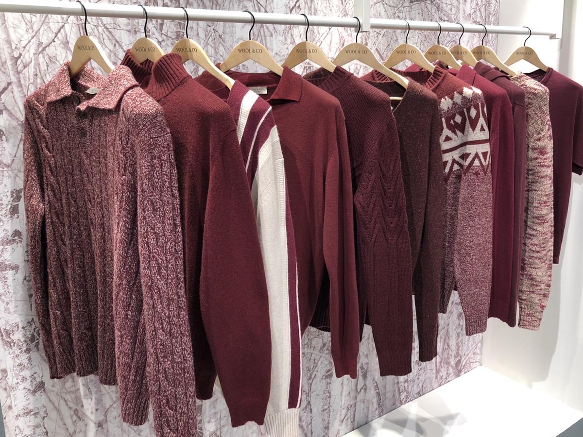 挿し色ではバーガンディが最も目立っていました。近年の挿し色トレンドだったパープルやピンクの流れを汲んだ系統だと思います。一見派手な色ですが、スーツのグランドカラーになるグレー、ネイビー、ブラウンどれとも相性が良いので、ニットや小物であれば意外と使い回しの効く色かもしれません。