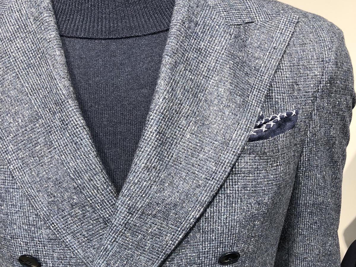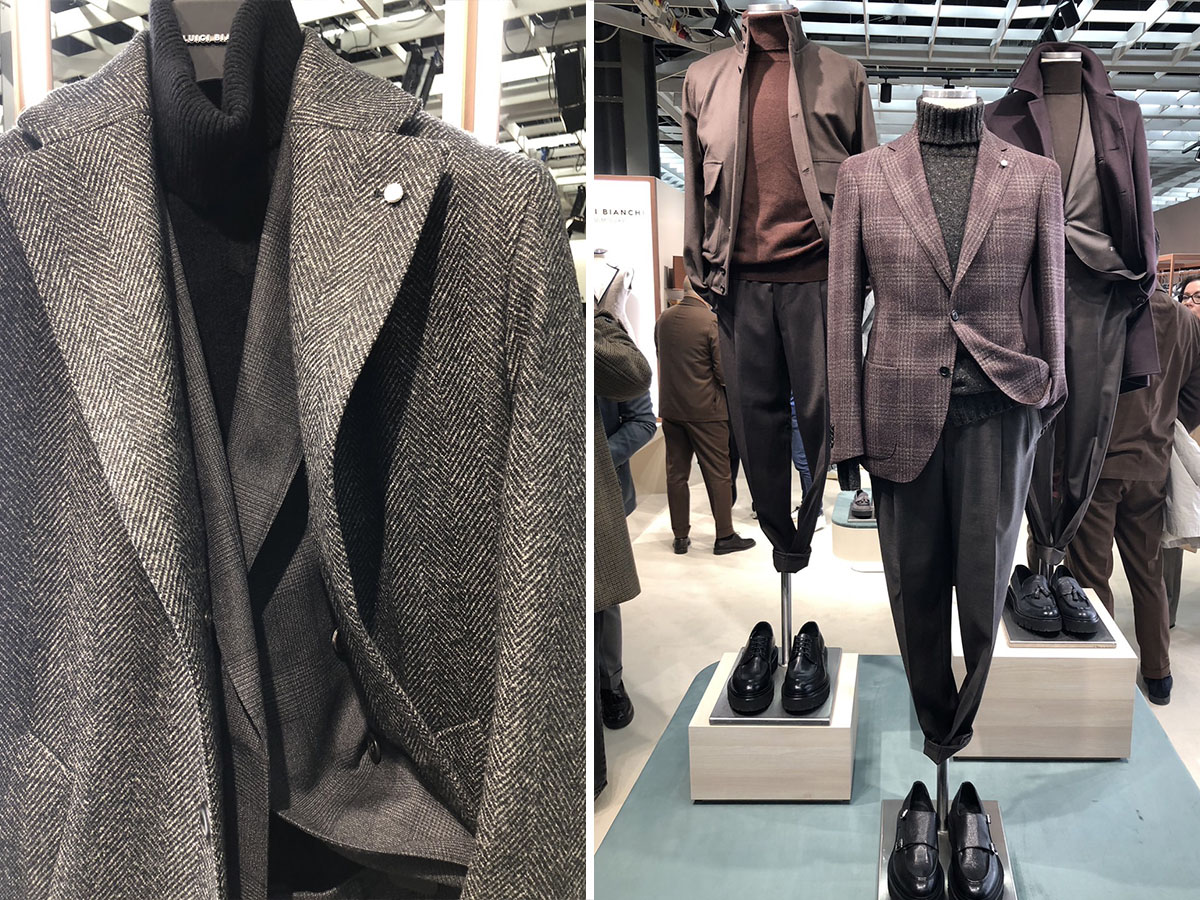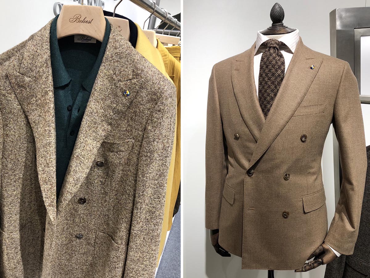 柄は圧倒的な無地トレンドの中で、メランジやドネガルなど表情感や奥行感のある無地調の打ち出しが目立っていました。これもウールだからこその表現と言えます。こういった柄の素材をヴィンテージライクになり過ぎず、すっきりモダンに仕立てている点もポイントです。
